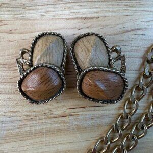A charming vintage jewelry set featuring a wood grain panel bracelet, heart charm bracelet, and matching clip-on earrings. A unique and timeless accessory.