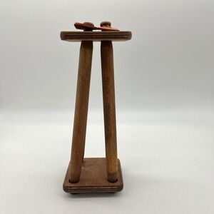 Original Wise Cracker, a vintage wooden nut cracker, features a unique twisting design to crack nuts effortlessly. Crafted from sturdy wood, this cracker consists of a square base, three supporting legs, and a smaller square top. A small, flat wooden piece with two circular indents is placed on top, designed to hold nuts in place while twisting. The cracker is a functional piece of vintage decor, showcasing a simple yet effective design for cracking nuts.