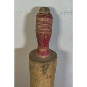 This vintage wood rolling pin with red handles is a charming addition to any farmhouse or primitive kitchen decor. Made in the United States, this 17" plain rolling pin features a 2 3/8" diameter and is crafted from wood, adding a rustic touch to your baking accessories collection. The red handles give it a pop of color and make it easy to grip while rolling out dough or pastries in your kitchen. Perfect for collectors or those looking to add a touch of nostalgia to their cooking space.