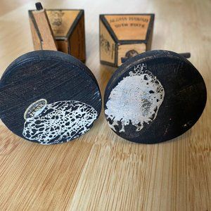 Over 40 years old and full of charm. These were originally part of a collector’s display and have glue/cardboard residue on the bottoms from being mounted (most has been removed). All shakers show signs of age, including scuffs, paint loss, discoloration, and chipping — please review photos carefully. No cork stoppers included.