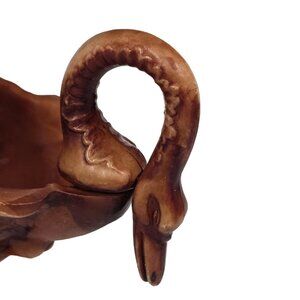 This intricate ceramic candle holder features a swan design, showcasing timeless elegance and craftsmanship. The rich brown tones add a warm, vintage charm to any decor.