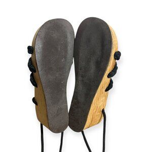 Vintage Wood Wedge Rope Sandals, Wrap Around Rope. Black