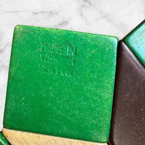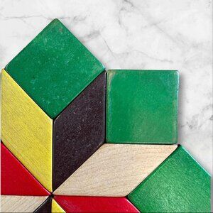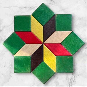 Vintage Wooden Abstract Star Design Trivet Western Germany Retro Kitchen. Green, black, red, yellow. 6.5 x 6.5 inches