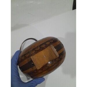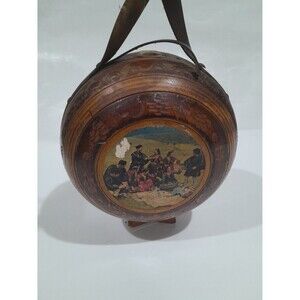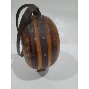 Wooden canteen features leather strap, etched design along wood. Wooden stand. No cork/top