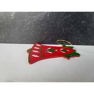 This is a flat wooden bell Christmas ornament in red with white and gren trim.