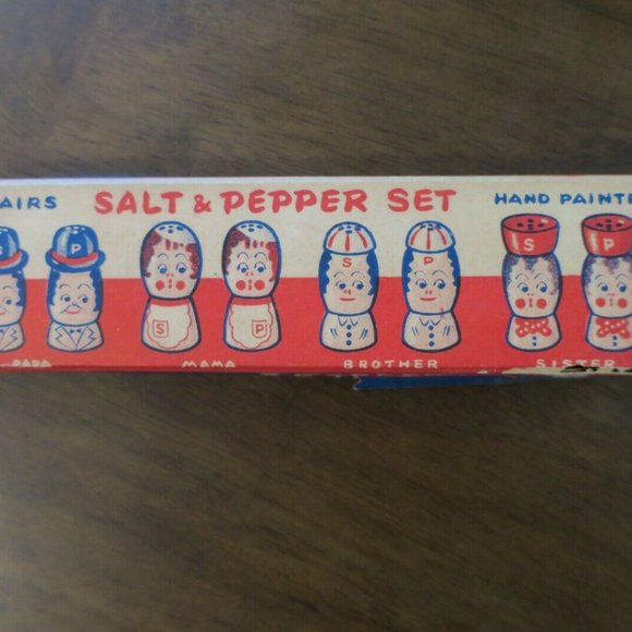 Vintage Wooden Family Hand Painted Salt & Pepper Set 4 Pairs Japan Orig. Box
