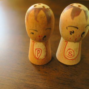Vintage Wooden Family Hand Painted Salt & Pepper Set 4 Pairs Japan