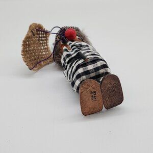 Vintage Wooden Fisherman Doll With Checkered Outfit & Straw Net Japan