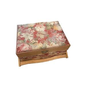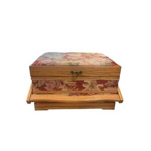 Vintage Wooden Floral Tapestry Sewing Box with Divider Tray Wood Handle Storage