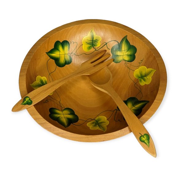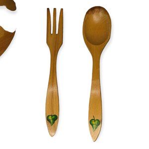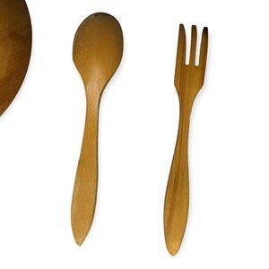 Vintage wooden footed bowl with matching utensils.