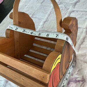 Charming wooden basket with colorful painted accents. Perfect for decor or storage.