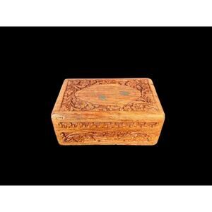 Vintage Wooden Hand Carved Brass Inlay India Sheesham Trinket Jewelry Hinged Box