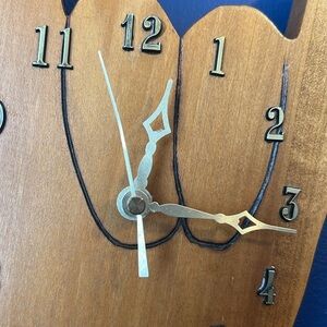 Vintage wooden hand gesture clock with gold hardware. Slight bend in second hand as pictured