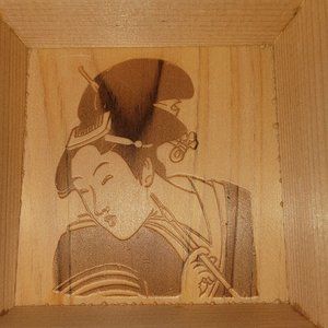 Vintage set of two wooden Japanese masu sake cups by Kotobuki. One cup depicts a geisha and the other a samurai warrior. Approx. outside measurements: 3.25"square and 2" height. Inside dimensions approx. 2 1/2 " square x 1 5/8" depth. Wooden sake box cup is great for chilled sake, served with a saucer to catch dripping or serve sake with a glass sake cup inside the wooden masu. Very good pre-owned condition. Please see photos. The photos are part of the description.