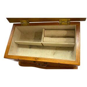 This vintage jewelry box offers a touch of elegance with its intricate brass handles and smooth wooden finish. Its velvet interior ensures your treasures are cushioned and protected. A classic piece that seamlessly blends functionality with timeless beauty, enhancing any room's decor while safeguarding your valuables.