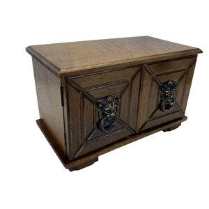 Vintage Wooden Jewelry Box With Lion Head Pulls & Hidden Compartments