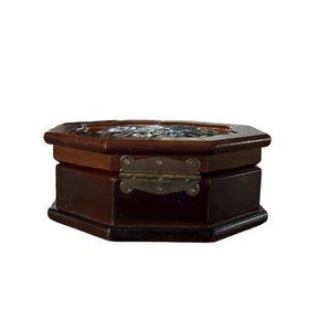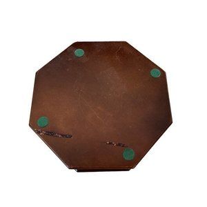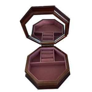 This Vintage Wooden Jewelry Box is in excellent preowned condition. This Octagon shaped Jewelry box is 6.5" x 6.5". It is 3 inches high. There is a mirror inside the lid - the bottom is lined with a pink velvety fabric. There is a hinge in the center back for easy opening. There are two marks on the bottom of the box which you can see in the last picture.