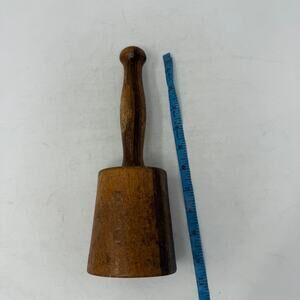 Authentic vintage wooden kitchen tool, likely used as a masher or tamper. Solid wood construction with a smooth turned handle and cylindrical base. Perfect addition to a farmhouse, primitive, or rustic kitchen collection. Can be used decoratively, in food photography, or as a functional old-world tool.