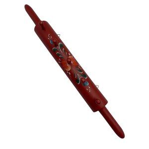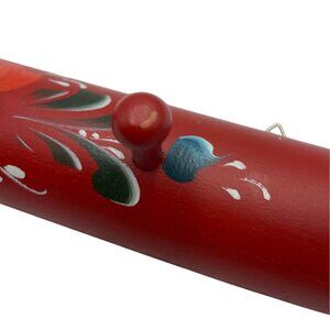 The rolling pin shaped wall hanging is painted with a traditional Rosemaling design, featuring stylized flowers and scrolls. Ideal for hanging lightweight items, like pot holders. From estate sale Norwegian collection.
