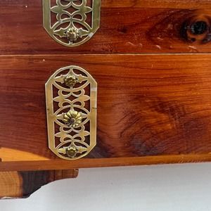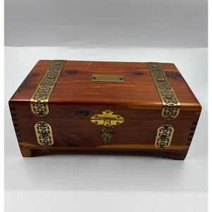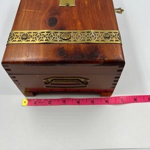 Vintage Wooden Latch Jewelry Storage Box Gold Tone Metal Blue Lining Mirror MCM