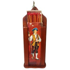 Vintage Wooden Long Matchstick Holder Wall Mount Fireplace w Revolution Colonial Soldier MCM 11"