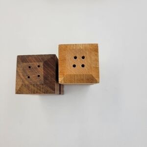 Small vintage wooden shaker set in unique Mid-Century Modern shape. In original box.