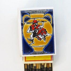 Vintage Wooden Match Box Painted Ceramic Tile Top Metal Box Greece Urn Soldier