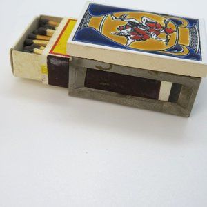 Vintage Wooden Match Box Painted Tile Top Metal Box Greece Urn Soldier Rare