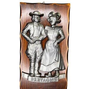 Vintage Wooden & Metal Bretagne France Barometer Man Woman Colonial 12”x4.5”