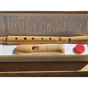 This is a vintage Moeck Tuju Flöte Flauto Dolce alto recorder made of wood in a beige color. The recorder is designed for playing music and is suitable for musicians looking for a traditional instrument with a warm tone quality. The Moeck brand is known for producing high-quality recorders, making this piece a desirable choice for collectors or players seeking a unique and well-crafted instrument.