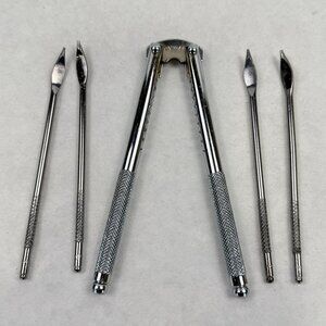 A classic vintage wooden nut dish featuring a hand-painted pinecone design, complete with chrome cracking tools and picks. Functional and elegant for serving nuts.