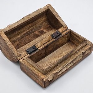 Vintage Wooden Owl on Branches Jewelry Chest - Rustic Hand Carved Trinket Box. Solid Wood (unknown - but medium weight). Lovely grain. Very unique primitive piece. 6x3 - hinged lid. Add a touch of whimsical charm to your jewelry collection with this Rustic Hand Carved Owl on Branches Motif Jewelry Chest Wooden Trinket Box. Perfect for storing your favorite trinkets and treasures, this intricately carved box features a delightful owl perched on graceful branches. Crafted from high-quality wood, this jewelry chest boasts a rustic aesthetic that will complement any decor. Keep your jewelry organized and secure while adding a unique accent piece to your dresser or vanity with this enchanting trinket box.