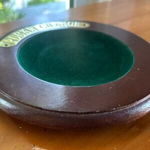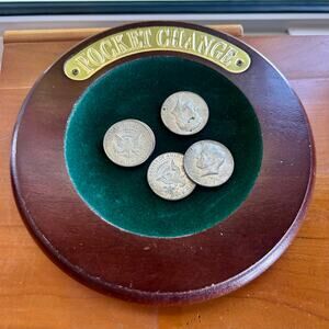 Vintage Wooden Pocket Change Dish with Green Felt Lining & Brass Plate