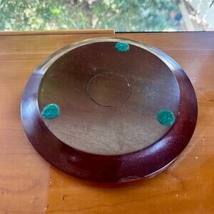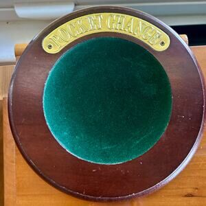 Vintage wooden round “Pocket Change” dish with brass nameplate and green felt-lined center. A classic valet-style catchall perfect for holding loose change, keys, or small accessories. The piece features a rich wood tone with minor edge wear consistent with age.