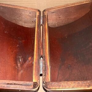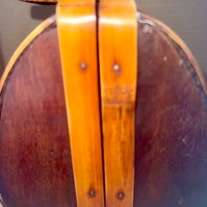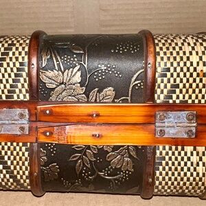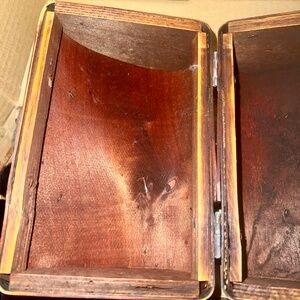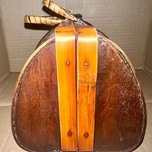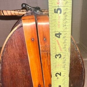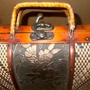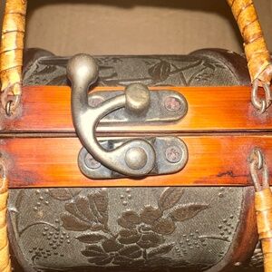 Small Wooden Purse. Features wooden handles, metal clasp and closure. Hand made ( see small nails used ). and ornate design. the center is black embellished with flowers and attached is black and white design. This is a gorgeous vintage purse. It could be used for special occasions or even as part a decor design.