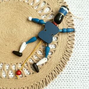 Vintage. Red white and blue wooden articulated dancing soldier. Pull string dancing figurine and/or ornament. Preowned. Some light signs of wear throughout. See photos for details.