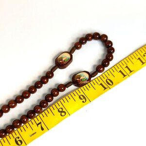 Vintage Wooden St. Benedict Rosary Corded Necklace Prayer Beads. Condition is preowned. This rosary features polished wooden beads, adorned with sacred St. Benedict imagery, and a sturdy wooden cross pendant for devotional use. (FC03)