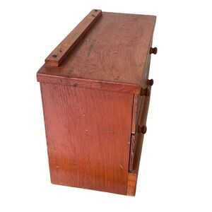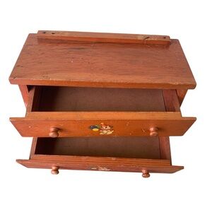 Super cute wooden box with drawers, looks like at one time there might have been a small mirror attached but is no longer there. I would use this for jewelry myself but would be cute in a number of ways.