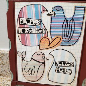 Looks to be hand painted and collaged. Features two birds and the saying "Always Together Never Apart".