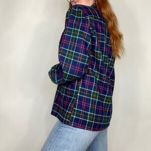 The top is navy, green, & red plaid print pattern, heavy material, boxy or fitted look depending on desired drape, button down shirt jacket Shacket plaid flannel top.