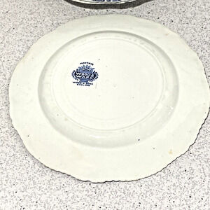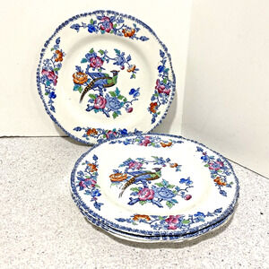 Vintage Woods Ware Made in England porcelain Mayfair salad plates - matching set of 4 - white porcelain with a blue and multicolor bird pattern. Each plate is about 8" diameter. Minor utensil marks but no damage or flaws - this set if in excellent condition with no significant damage or flaws. So pretty!