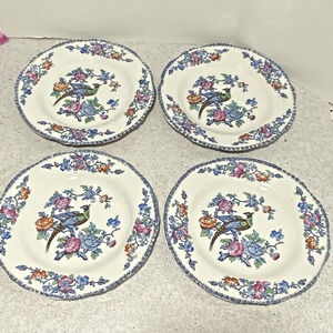 Vintage Woods Ware Made in England porcelain Mayfair salad plates - matching set of 4 - white porcelain with a blue and multicolor bird pattern. Each plate is about 8" diameter. Minor utensil marks but no damage or flaws - this set if in excellent condition with no significant damage or flaws. So pretty!