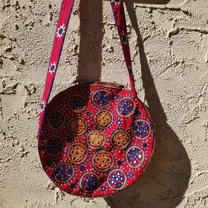 Beautiful vintage hippie chic circle purse, small signs of wear, small circular patterns with sewn in mirror details