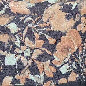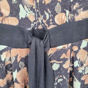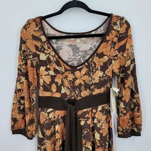 This elegant vintage 90's dress features a beautiful floral design on a brown base. It's made from soft wool and angora, has long puff sleeves, and falls to a classic tea length. The style is reminiscent of the 70s, bringing a touch of retro charm to your wardrobe.