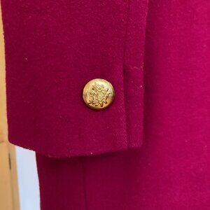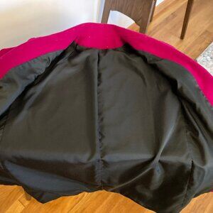 Oversized Wool Blazer in magenta or dark pink. Single fancy gold button closure with two front pockets, There is a stain on the right hand sleeve near the cuff, as pictured. Good vintage condition with no rips, tears or holes.