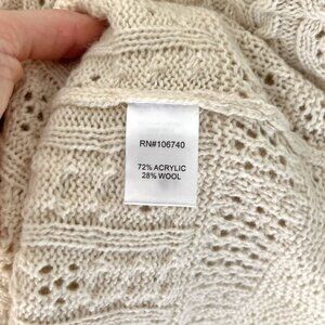 VGUC cream colored wool blend knit sweater from vintage brand North Style! Worn before with light texture but no major flaws or signs of wear. Features scalloped neckline and hem, and intricate lacey knit pattern. Very unique and cozy! Looks super cute over a mini skirt or wide leg pants - just the right amount of feminine cuteness to balance a look out! A great sweater for the holidays! Vintage construction is very high quality!