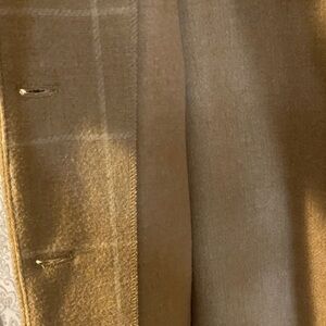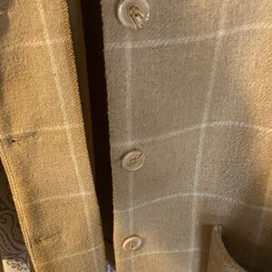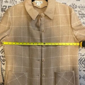 Elegant plaid pea coat with a classic design. Features convenient front pockets and a secure button closure. Perfect for stylish layering in cooler weather.