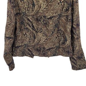 A chic vintage Chico's button-up jacket in brown gold paisley jacquard brocade. This regal piece doubles as a blazer and shirt, perfect for versatile styling. Front button flap breast pockets.