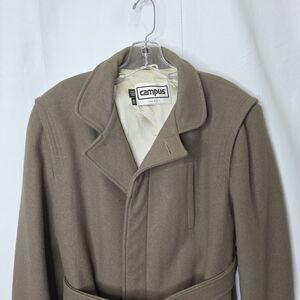 Vintage Campus wool trench coat, men’s size 40. Brown with full lining, button-front closure, belted waist, and side pockets. Classic mid-century styling, Made in USA. Durable and warm outerwear.