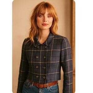 Channel timeless preppy sophistication with this vintage wool cropped blazer in a rich blue-green plaid pattern. Tailored in a double-breasted silhouette with classic buttons, it strikes the perfect balance between polished and playful. The structured cut and cropped length make it versatile—ideal for layering over crisp button-downs, knits, or dresses.